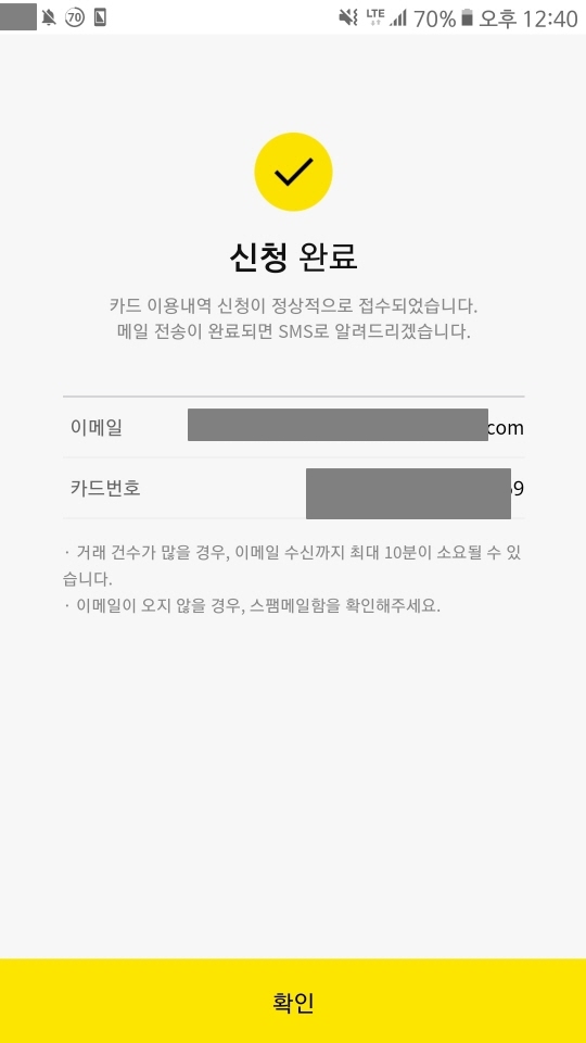 " 카드 이용내역 다운로드 이메일로 받기 > "