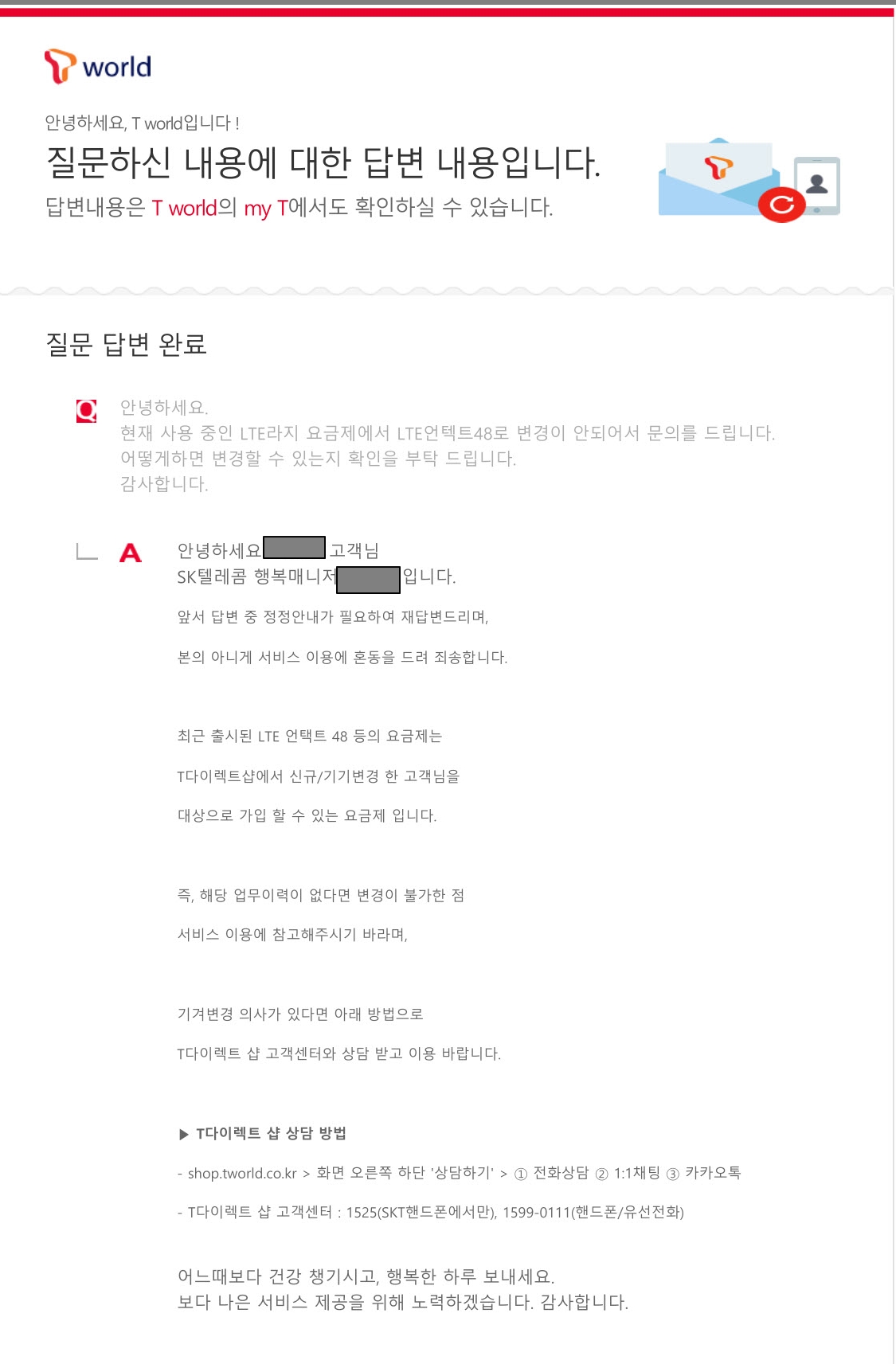 sk텔레콤에서 어제 문의에 대해서