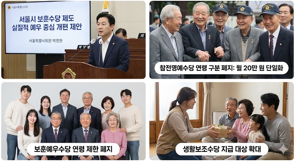 서울특별시의회 박영한 의원(국민의힘, 중구 제1선거구)이 서울시의 보훈 수당 제도를 실질적인 예우 중심으로 개편해야 한다고 주장하며 세 가지 구체적인 개선 방안을 제안하는 내용입니다.